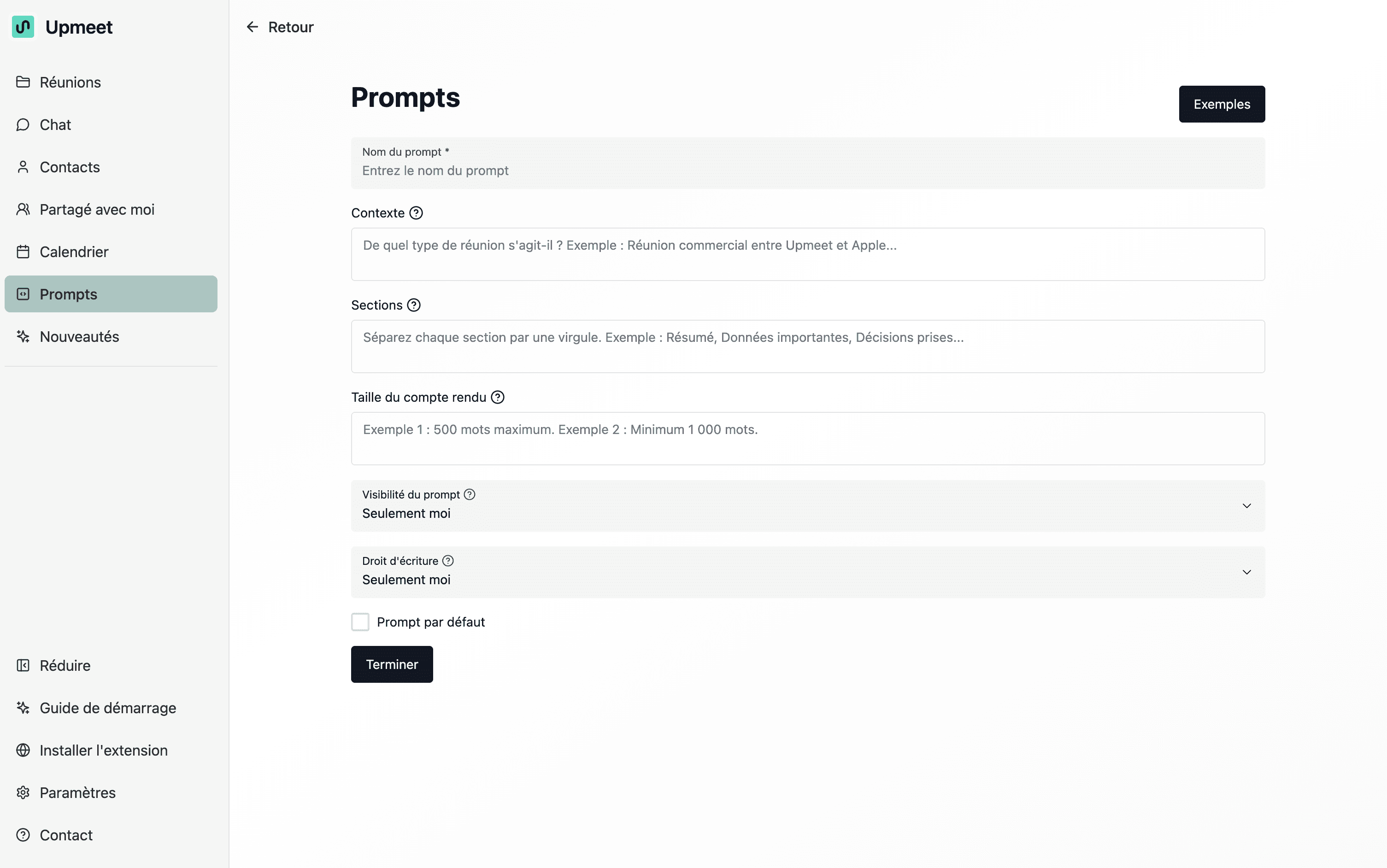 Un prompt est un modèle qui indique à Upmeet comment structurer le compte rendu d’une réunion.