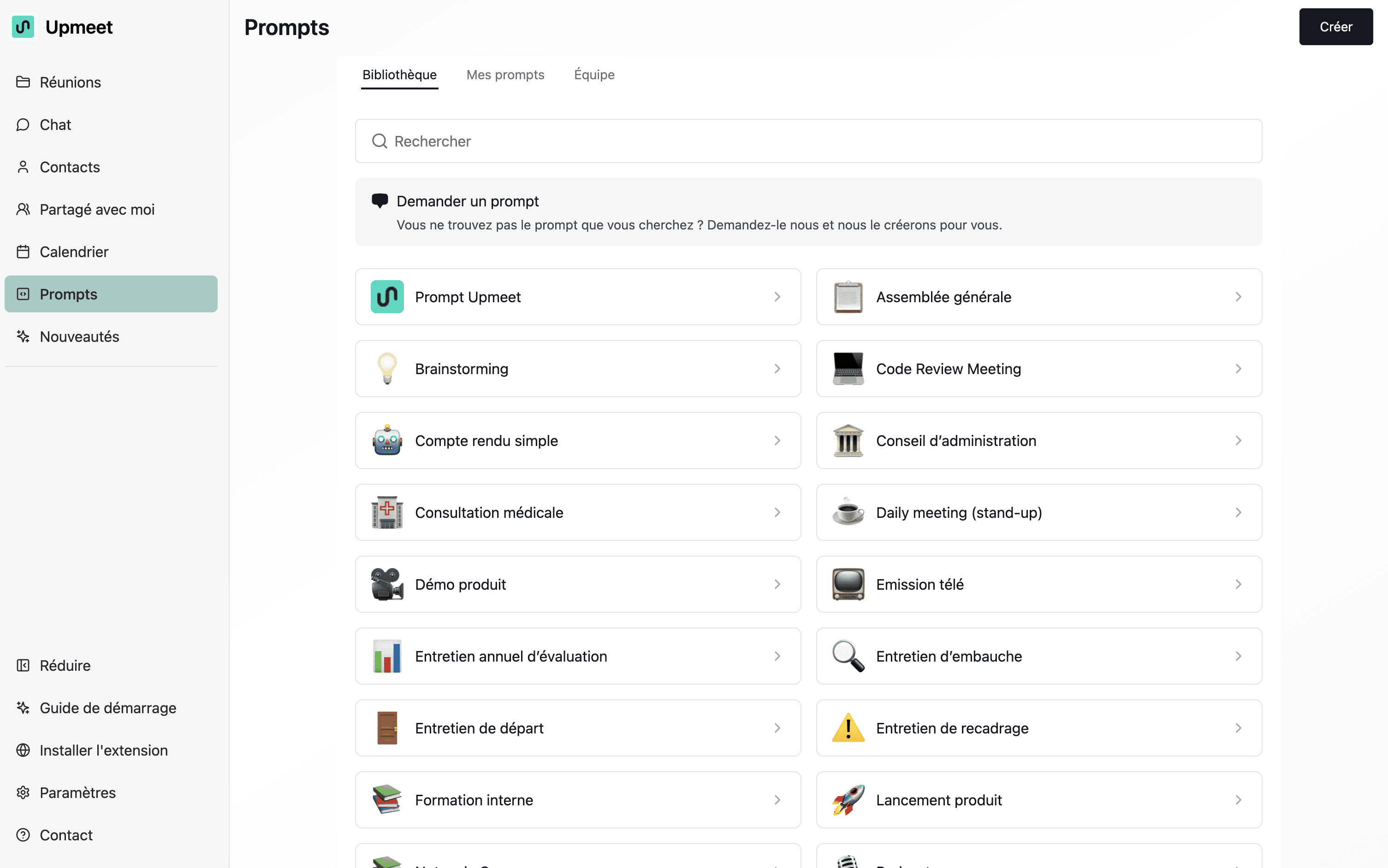 Upmeet propose une série de prompts prêts à l’emploi, conçus pour les cas d’usage les plus courants.