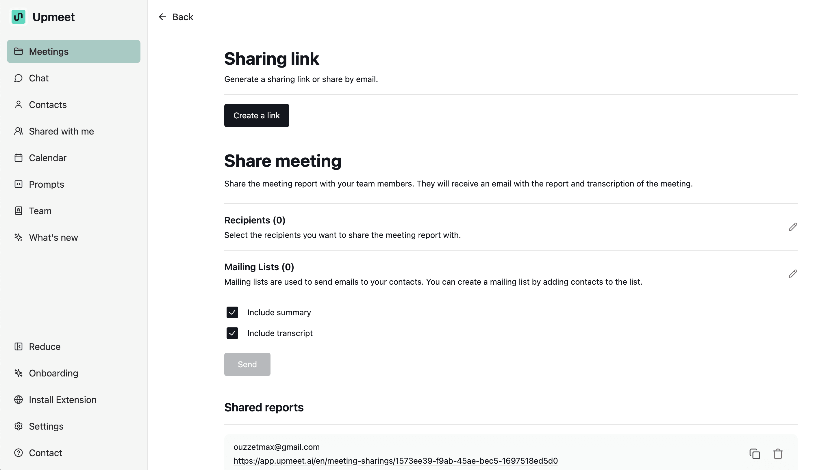Share | Sends the report and possibly the transcript via email |
