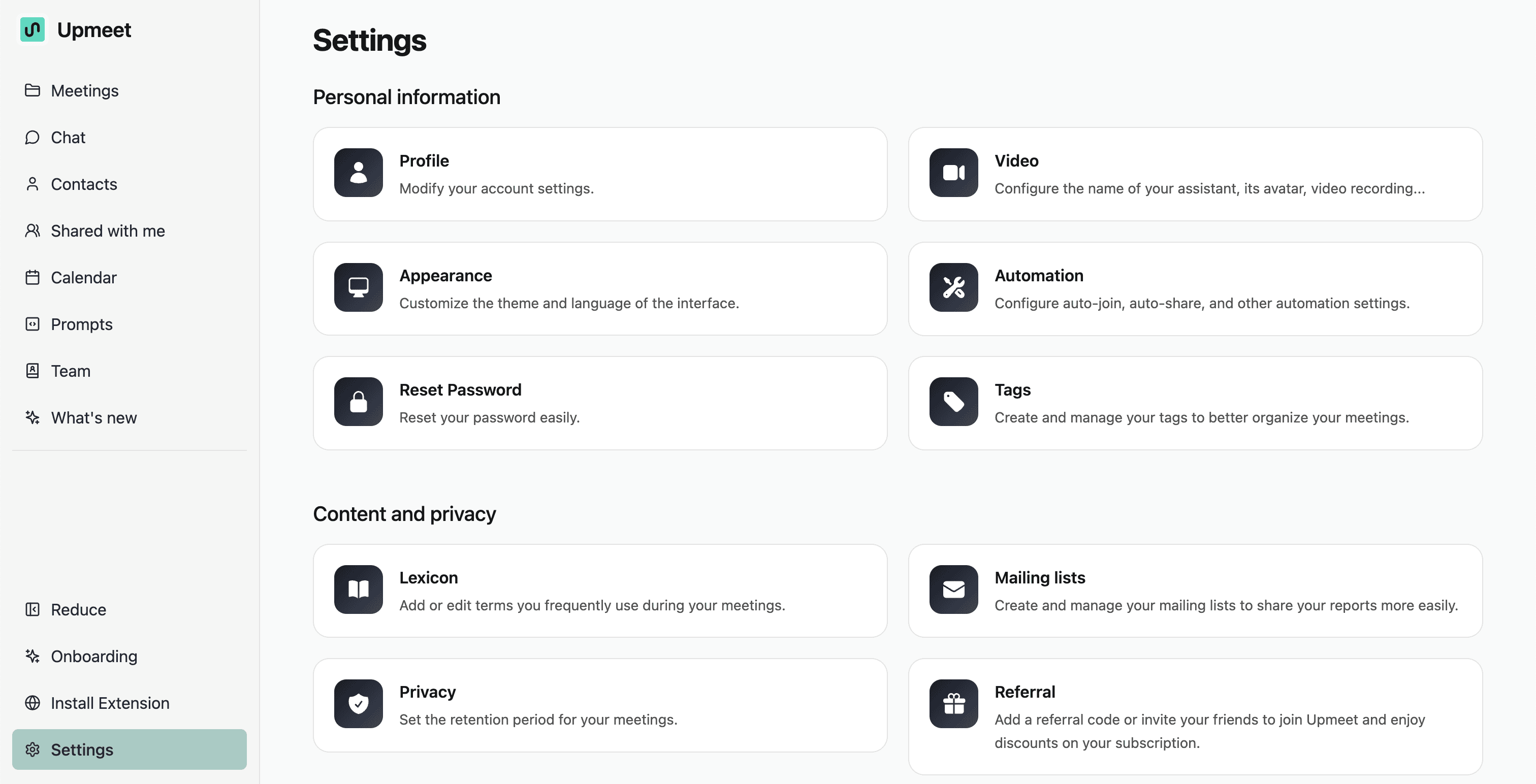 This page details all the settings available in Upmeet to customize your experience, manage your team, configure your security, automate your workflows, manage your tags, your lists, your glossary, your SSO, and your API access.