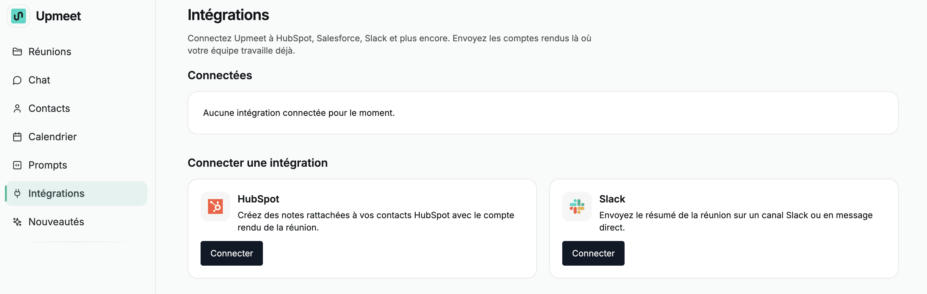 En intégrant HubSpot avec Upmeet, vous synchronisez automatiquement les données de vos réunions vers votre CRM.