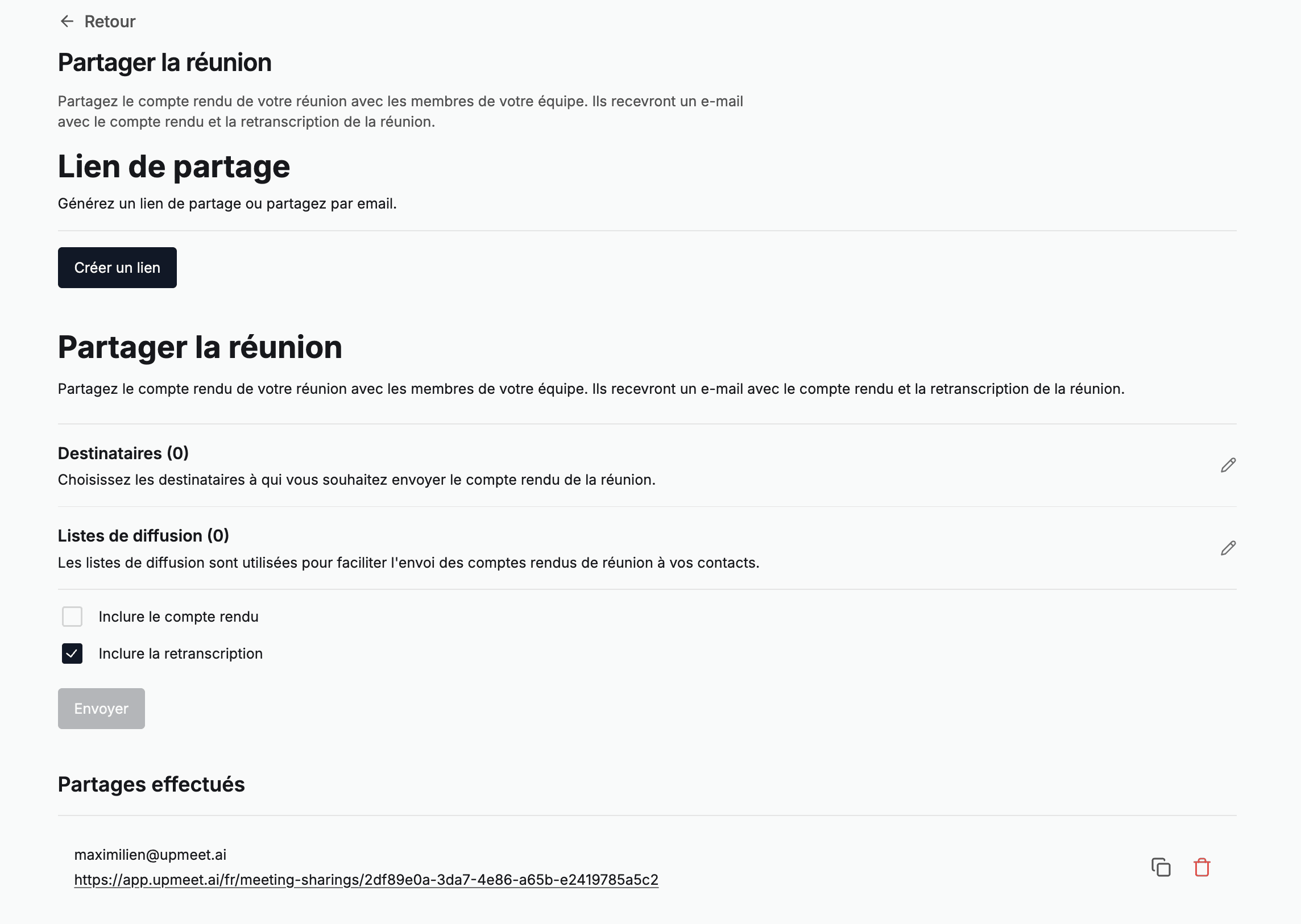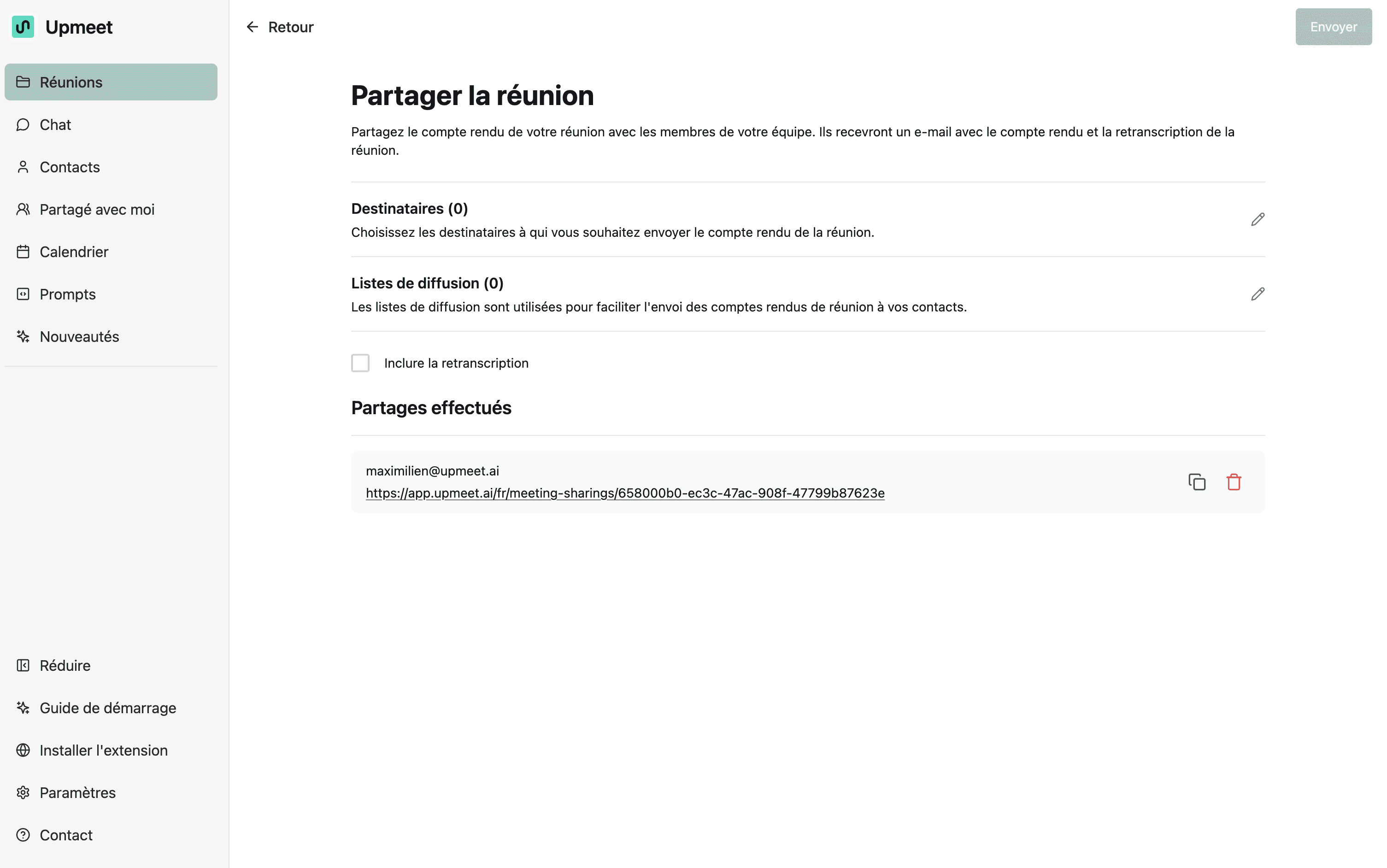 Partager | Envoie le compte rendu et éventuellement la transcription par email |